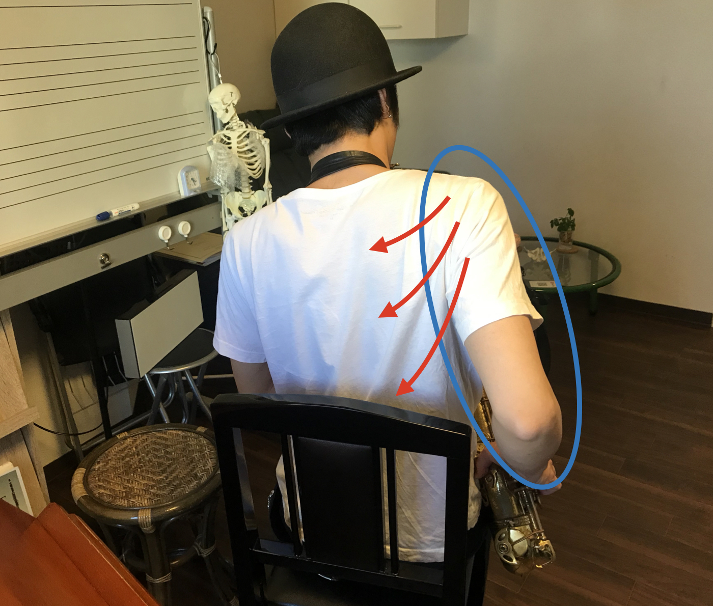 これ以上腕は後ろにしたら絶対だめ!ということはもちろんなく、自由に動けることが音のコントロールには大切ですが、構えた姿勢がデフォルトでこれよりも腕を引っ張っていると呼吸の扱いに関しては構造的に不利になってしまします。